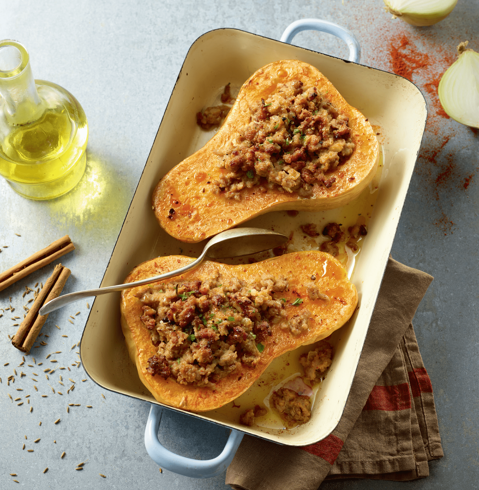 Mélangez. Garnissez de cette farce les 2 moitiés de courge précuites.