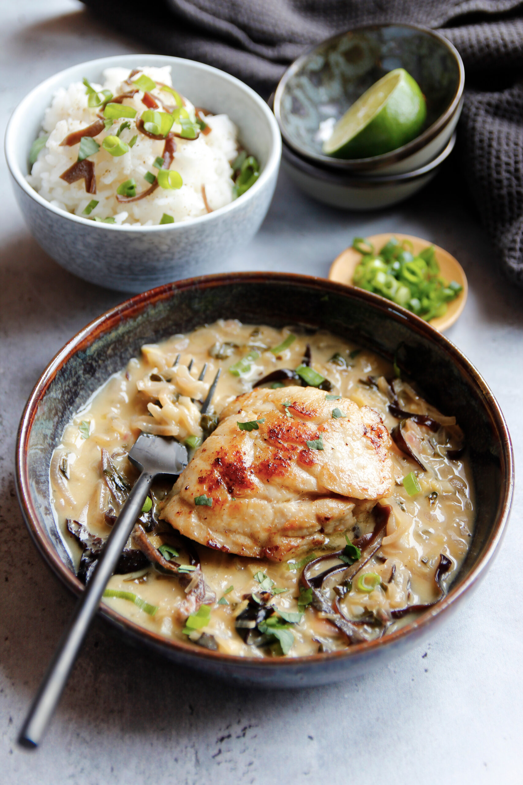 Répartissez la sauce crémeuse thaïlandaise dans des assiettes creuses, ajoutez les ris de veau, parsemez de ciboule ciselée